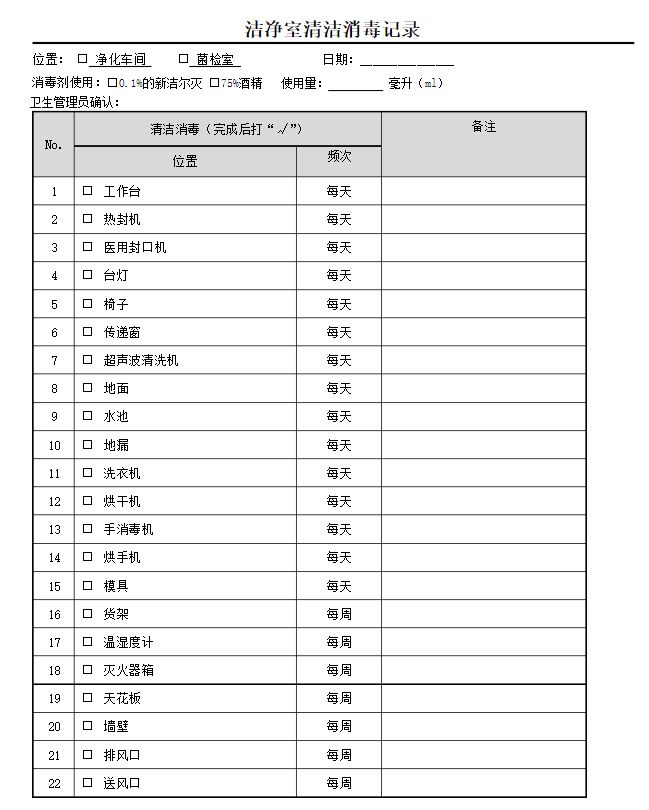 把一些位置寫出來,比如在哪個(gè)車間、哪個(gè)菌檢室;然后就是日期;再就是消毒劑的使用,用了多少、用的哪種消毒劑;Zui后留出一個(gè)簽字的地方即可。